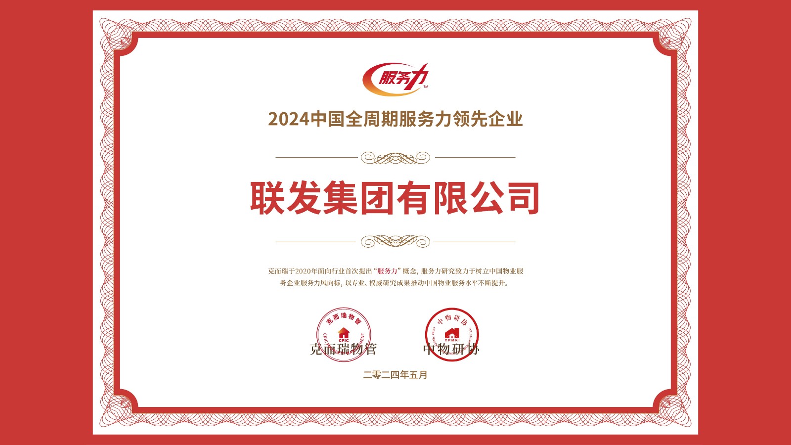 联发集团获“2024中国全周期服务力领先企业”等奖项